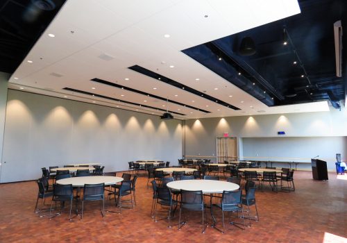 This highly customizable, dividable second-floor space is perfect for banquets, small-to-medium meetings, and small-to-medium presentations. There are 4 Suites, each named after a nearby mountain surrounding the campus. Audio-visual equipment is available upon request, with a built-in projection screen in every room and wheel-in LCD displays available. The full set of suites combines to 85’x34′, while each room is approx. 34’x21′. Photos of this space may be viewed here (1 Suite), here (1 Suite), here (2 Suites), here (3 Suites), and here (4 Suites).